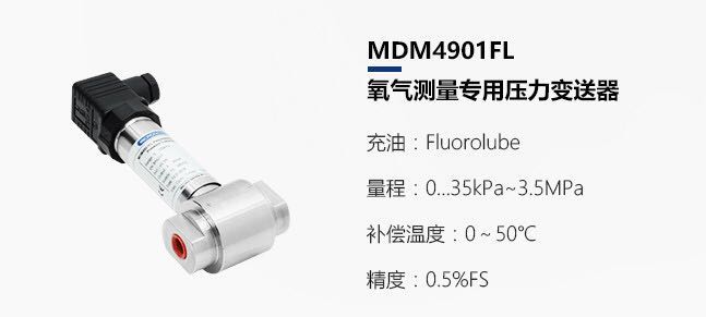 MDM4901FL氧氣測量差壓變送器,針對氧氣壓力測量的應用要求,在保證產品潔凈的同時,產品內部充灌了Fluorolube?油。該充灌介質的使用防止了硅油與氧氣發生氧化反應, 有效防范爆炸的發生。同時在整個產品生產過程中采用禁油工藝,保證產品整機可以滿足氧氣的測量要求。