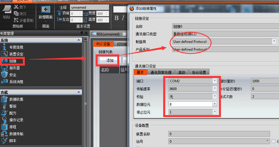 操作說明;功能可以從FvDesigner軟件 項目管理>>鏈接中添加一個鏈接選擇User-defined ProtocoL如圖1。打開協議設置選項就可添加自定義協議通訊數據幀如圖2.