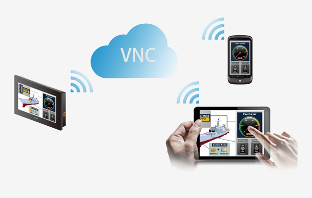 2.VNC功能。一般的設備操作,操作員只需在HMI操作界面操作就可以了。如果說HMI置放的位置不方便經(jīng)常或者長時間操作,或者操作員想隨時隨地查看和操作HMI界面,這時永宏C3/P5系列觸摸屏就能很好的幫您解決這個問題。針對操作員不在HMI操作界面現(xiàn)場的情況,操作員可以在電腦上使用VNC客戶端,或者手機上下載VNC軟件,通過網(wǎng)絡,可直接將HMI的畫面顯示在電腦或者手機上,同時也能在電腦或手機上操作,支持此功能的HMI需配帶以太網(wǎng)接口。